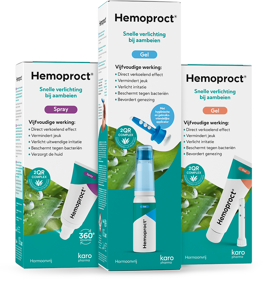 Hemoproct® zorgt voor een snelle verlichting van anale ongemakken. Het is gebaseerd op natuurlijke ingrediënten en kan worden gebruikt in geval van terugkerende ongemakken of tijdens de zwangerschap. Het 2QR-complex, geëxtraheerd uit aloë vera, vormt een fysieke barrière die beschermt tegen schadelijke bacteriën.